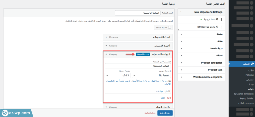 يمكنك أيضًا التحكم في مظهر القائمة الضخمة من تبويب “Mega Menu” أو القوائم على الهاتف المحمول من خيار “Mobile Menus“.
