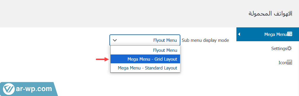 الآن يتم تحديد طريقة عرض القائمة الضخمة المناسب، يٌفضل الاعتماد على طريقة العرض “Mega Menu – Grid Layout” حيث توفر مرونة في تخطيط القائمة على هيئة شبكة من الصفوف والأعمدة عن طريق السحب والإفلات مباشرًا.