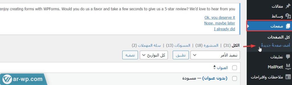 في البداية نحتاج لإنشاء صفحة جديدة من خلال الانتقال إلى تبويب صفحات في لوحة تحكم الووردبريس ثم النقر على خيار أضف صفحة جديدة بعنوان “صفحة هبوط لمطعم”.