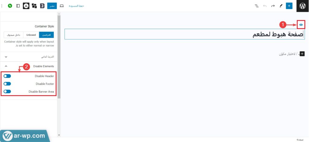 بعد إنشاء الصفحة، نفتحها في محرر المكونات، وسيتعين علينا إخفاء عنوان الصفحة بالنقر على رمز العين الموجود بجانب عنوان الصفحة حتى لا يظهر هذا العنوان لزائر الموقع، كما سنقوم بتعطيل عرض ترويسة وتذييل الصفحة بالنقر على خيارات Disable Header وDisable Footer وDisable Banner Area من تبويب تخصيص القالب من أجل تبسيط التصميم وجعل الزائر يركّز على هدف الصفحة الأساسي كما توضح الصورة التالية: