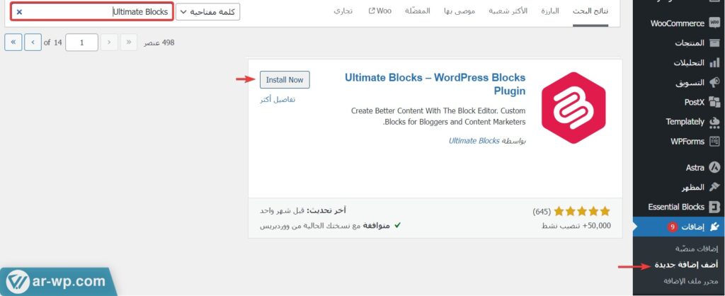 لتثبيت إضافة Ultimate Blocks على موقعك انتقل إلى لوحة تحكم ووردبريس الخاصة بموقعك ثم توجه إلى (إضافات) >> (أضف إضافة جديدة)، بعد ذلك قم بكتابة اسم الإضافة في مربع البحث وبعد أن تظهر نتيجة البحث قم بتثبيت الإضافة وتفعيلها على موقعك كما توضح الصورة التالية. أو اقرأ كيفية تنصيب إضافات ووردبريس بالشكل الصحيح .