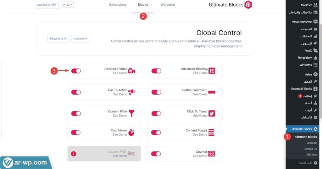 بعد تفعيل إضافة Ultimate Blocks، سيظهر تبويب جديدًا باسم الإضافة، وتستطيع الوصول إلى مكونات وميزات الإضافة من خلال النقر على التبويب الخاص بها ومن ثم اختيار تبويب (Blocks)، كما يمكنك من خلال هذا التبويب أن تعطل أي مكون لا ترغب باستخدامه من أجل تسريع وتحسين أداء موقعك.