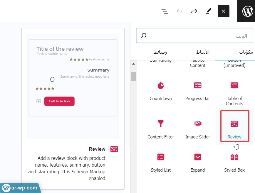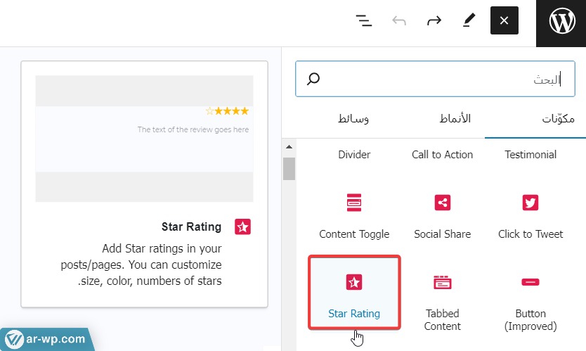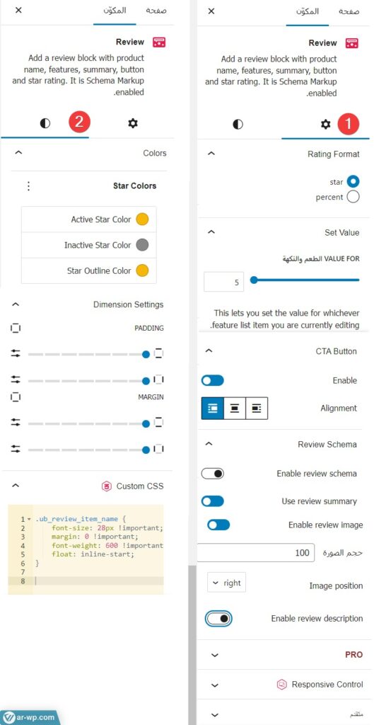 ستلاحظ وجود العديد من الخصائص التي يمكن إعدادها لمكون المراجعة ومنها تعديل تنسيق التقييم (نجوم أو نسبة مئوية) وتعديل لون النجوم عندما تكون محددة ولونها إذا لم تكن محددة ولون حدودها.