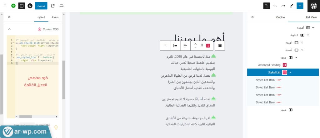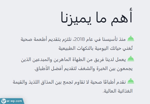 بعد ذلك نضيف أسفله مكون قائمة منسقة (Styled List) لنسرد فيها أهم نقاط قوة المطعم كمميزات الوجبات المقدمة والمكونات المستخدمة فيها وخبرات العاملين وغيرها من المميزات لجذب انتباه الزوار وتحفيزهم على اتخاذ إجراء طلب الطعام.