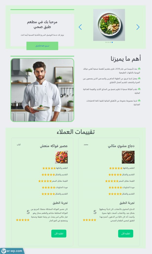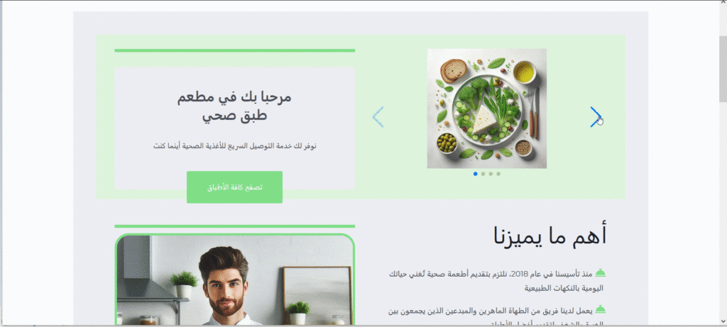 بعد أن انتهينا من إضافة وتخصيص جميع المكونات الضرورية لتصميم صفحة الهبوط الخاصة بالمطعم الصحي، حان وقت معاينتها النهائية في المتصفح، ستظهر صفحتنا على النحو التالي:
