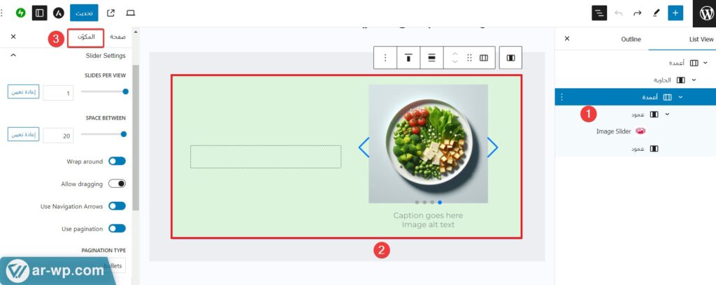 بعد ذلك نضيف في العمود الأيمن مكون شرائح الصور المتحركة Image Slider ونرفع فيه صور مجموعة من الأطباق الصحية التي يوفرها المطعم ليتنقل الزائر بينها، وتستطيع كتابة نص توضيحي (Caption) يظهر أسفل كل صورة.