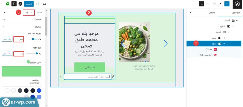 بعد ذلك نضيف في العمود الأيسر مكون فاصل (Divider) في الأعلى بلون أخضر (#80DD88)، ونضيف تحته مباشرةً مكون اتخاذ إجراء (Call To Action) لتحفيز الزوار على اتخاذ إجراء طلب الطعام من مطعمنا الصحي، ونضيف في هذا المكون عنوان H2 ونكتب ضمنه “مرحبا بك في مطعم طبق صحي” ومحتوى يتضمن عبارة “نوفر لك خدمة التوصيل السريع للأغذية الصحية أينما كنت”.