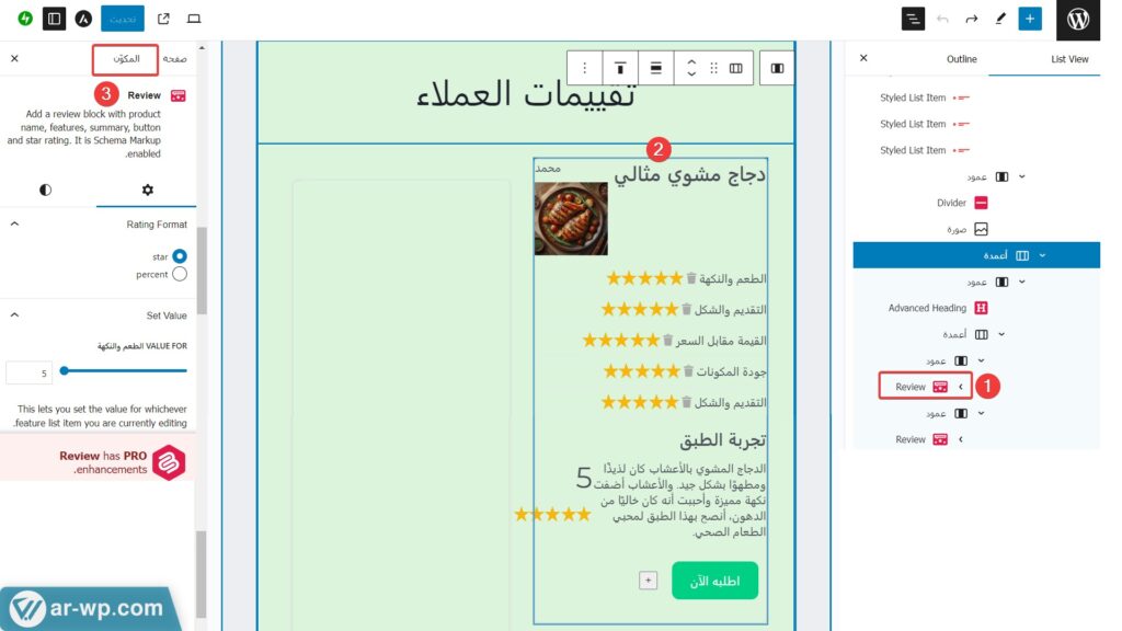 يمكننا أيضًا إضافة نص يصف تجربة العميل للطبق وعرض التقييم النهائي العام للطبق، كما سنضيف ضمن المراجعة زر “اطلبه الآن” لنقل الزائر لصفحة طلب هذا الطبق مباشرة.