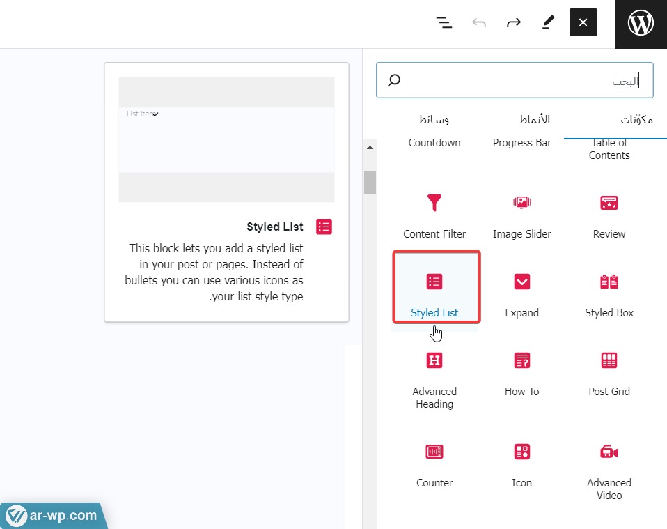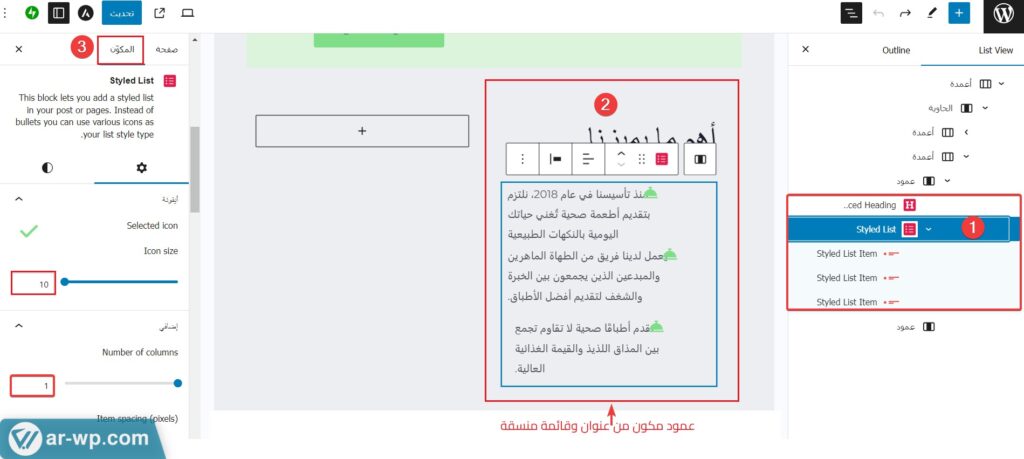 يضيف هذا المكون قوائم منسقة تتضمن أيقونات مختلفة بدلاً من النقاط التقليدية ويمكنك التحكم في حجم ولون هذه الأيقونات وغيرها من خيارات تخصيص عناصر القائمة.