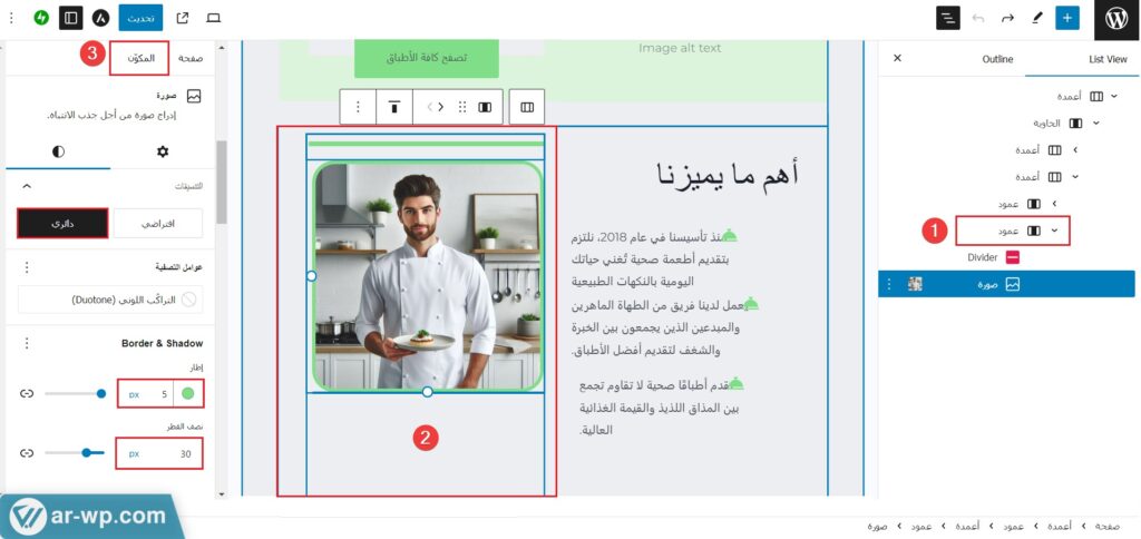 بعد ذلك نضيف في العمود الثاني مكون فاصل Divider بلون أخضر وتحته مكون صورة (Image) ونرفع فيها صورة الشيف المسؤول عن طهي الأطباق، ثم نجعل محاذاتها نحو اليمين ونخصصها لتكون بتنسيق دائري ونضع حولها إطارًا أو حدًا بلون أخضر لإبرازها، ونحدد قيمة نصف قطر الإطار لتكون بقيمة 30 بكسل، وسيظهر العمود بشكله النهائي على هذا النحو: