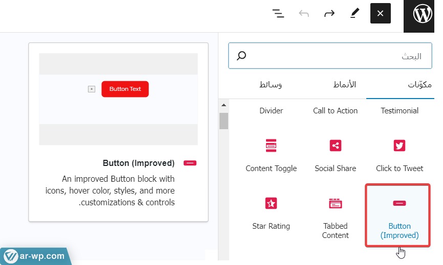 يساعدك هذا المكون على إضافة أزرار احترافية بتصميمات مختلفة وأشكال قابلة للتخصيص، مثل تخصيص أيقونة الزر وإضافة تأثير عند مرور مؤشر الفأرة فوقه والعديد من التنسيقات وخيارات التخصيص الأخرى.