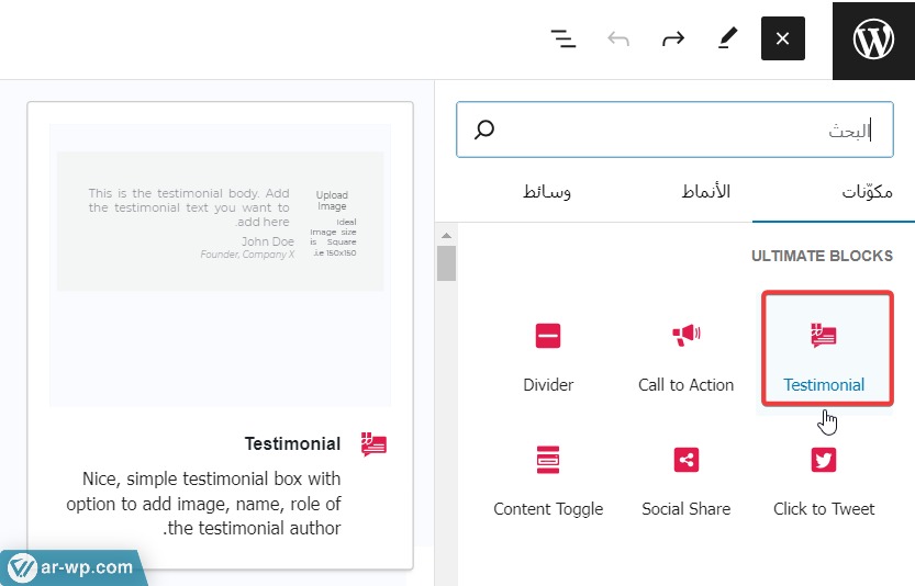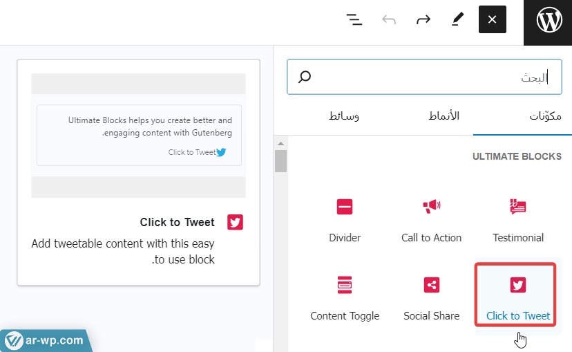 بمجرد تفعيل إضافة Ultimate Blocks، ستضاف جميع مكوناتها إلى محرر جوتنبرج الافتراضي، وكل ما عليك فعله لاستخدام أي مكون منها هو تحرير أي صفحة أو مقالة في موقعك والنقر على أيقونة زائد (+) في الجزء العلوي الأيمن من المحرر، بعد ذلك مرر للأسفل إلى قسم Ultimate Blocks لرؤية كافة المكونات الخاصة بالإضافة. اختر المكون الذي تريده وانقر فوقه لإضافته مباشرةً إلى الصفحة أو قم بسحبه وإفلاته في الموضع الذي تريده.