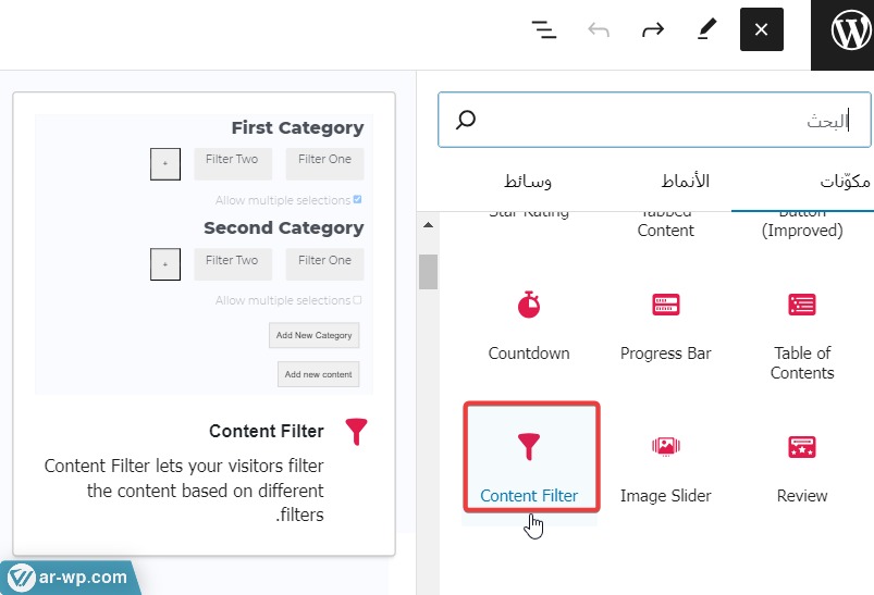 يساعد هذا المكون في فلترة المحتوى المعروض في موقعك بناءً على معايير مختلفة مما يسهل على زوار الموقع تصفحه والعثور على المحتوى الذي يهمهم بسهولة أكبر.