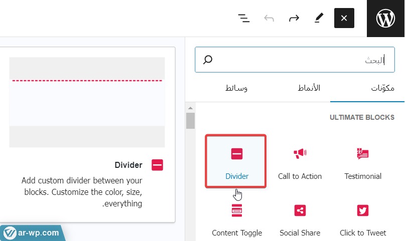 يستخدم هذه المكون لإضافة خط فاصل بين أقسام المحتوى المختلفة ويساعد على تنظيم مكونات الصفحة بشكل أفضل، وتستطيع تخصيص لون وحجم هذا الفاصل بالطريقة التي تناسبك.