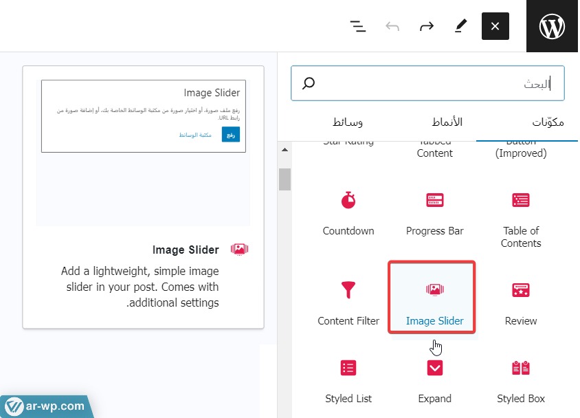 يستخدم هذا المكون لعرض شريط لمجموعة من الصور التي يمكن التنقل بينها من خلال شريط تمرير يجعل طريقة عرض الصور أكثر أناقةً وتفاعلية.