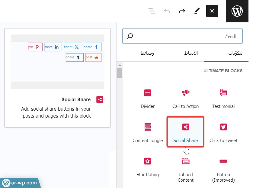 يسمح لك هذا المكون إضافة أزرار لمشاركة المحتوى على مختلف وسائل التواصل الاجتماعي مما يسهل على الزوار نشر محتوى الموقع ويسهم في زيادة انتشاره.