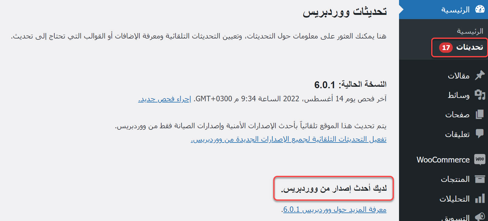 ويمكن التحقق من أن آخر نسخة من برنامج الووردبريس مثبتة لديك من صفحة التحديثات في الواجهة الخلفية للموقع التي يمكن الانتقال إليها عبر النقر (تحديثات) الموجودة ضمن بند (الرئيسية) في القائمة الجانبية، حيث ستجد معلومات عن الإصدار الحالي المثبت لديك من الووردبريس، وسيكون بإمكانك التحديث إلى آخر إصدار مباشرة. كما يمكنك أيضًا تحديث القوالب والمكونات الإضافية المثبتة لديك من تلك الصفحة.