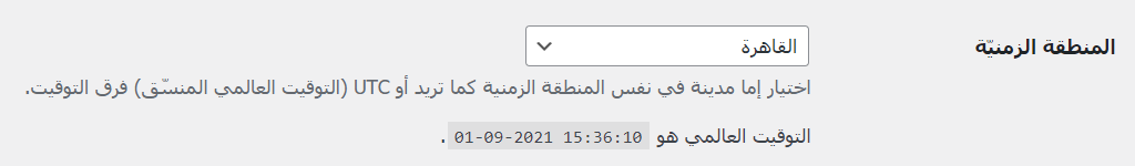 في حالة أنك لم تجد مدينتك ضمن المدن المتوفرة، فيمكنك اختيار توقيت باستخدام تنسيق UTC (التوقيت العالمي المنسّق)، حيث تختار أحد إعدادات Etc GMT التي تساوي عدد الساعات التي توضح الفرق بين التوقيت في مدينتك وبين توقيت غرينيتش.