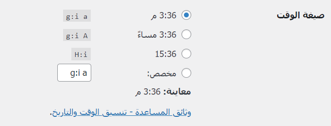 يمكنك من هذا الإعداد ضبط طريقة عرض التاريخ. كثير من قوالب الووردبريس تبرمج بطريقة لتعرض التاريخ، ولكن دون الاهتمام بطريقة عرضه، وأنت عليك ضبط صيغة العرض من هذا الإعداد. يتم التحكم في عرض التاريخ باستخدام أحرف مكتوبة باللغة الإنجليزية، وإليك هذه الأحرف ودلالة كل منهما.