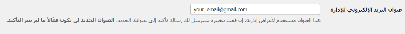 يُعرض هنا البريد الإلكتروني الخاص بمدير الموقع، وإذا أردت تغيير الإيميل من هذا الإعداد، فلابد لك أن تؤكد على الإيميل الجديد عبر رسالة إليكترونية تصل لك.