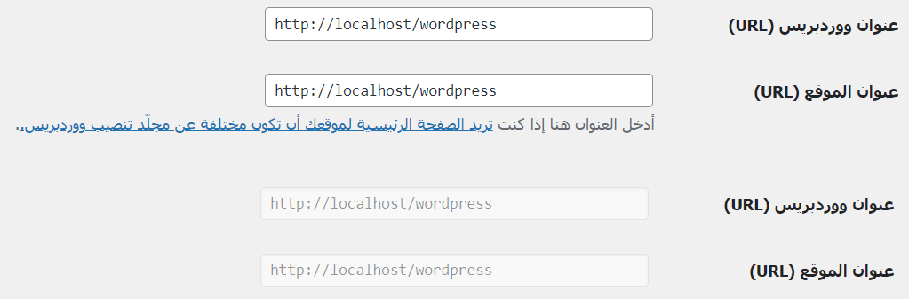 السبب في ذلك أنه إذا تم تعيين الرابط الخاص بملفات الووردبريس عبر ملف wp-config.php بتعريف WP_SITEURL فستغلق الخانة ولا يمكنك التعديل عليها إلا عند حذف الكود من ملف الكونفيج وبعدها ستجد أنه بإمكانك التعديل من إعدادات الووردبريس مباشرة.