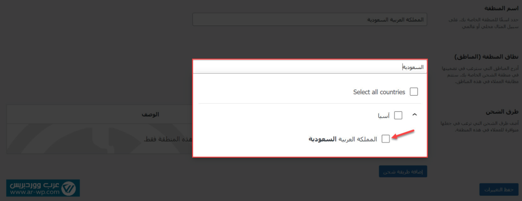 بعد ذلك، قم بتحديد اسم ونطاق منطقة الشحن المطلوبة لمتجرك. على سبيل المثال، يمكنك تحديد منطقة الشحن إلى المملكة العربية السعودية.