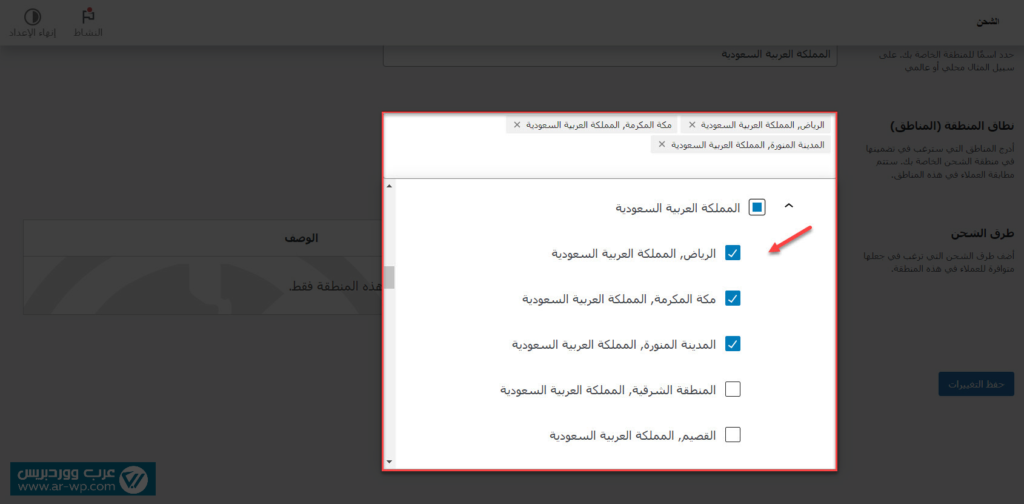 بعد ذلك، يمكنك العودة إلى نطاق المنطقة وسيكون قد تم إضافة كافة الإمارات في المملكة العربية السعودية. على سبيل المثال، يمكنك اختيار الرياض ومكة المكرمة والمدينة المنورة كمناطق شحن.