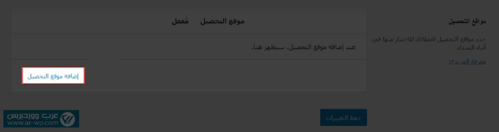إذا كان استلام المنتجات من منافذ البيع المحلية مجانيًا، فقم بإلغاء تفعيل خيار “إضافة سعر خاص بالعملاء الذين يختارون التحصيل المحلي“. ثم، قم بالتوجه إلى قسم “مواقع التحصيل” واضغط على زر “إضافة موقع التحصيل” لإضافة جميع نقاط البيع أو التوزيع لمنتجات متجرك.