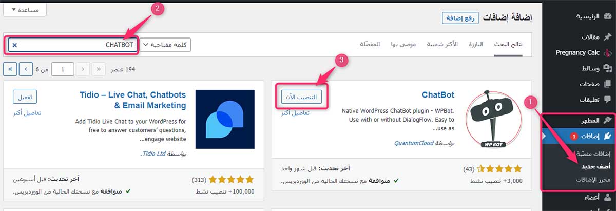 - ابحث عن ChatBot ثم قم بتنصيب وتفعيل الإضافة كما هو موضع في الصورة أدناه.