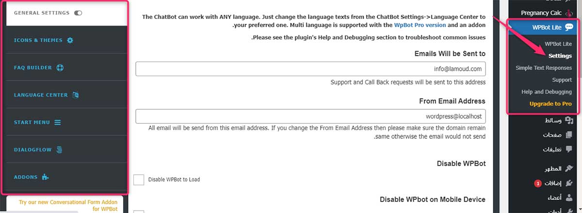 - GENERAL SETTINGS : لعمل الإعدادات الأساسية لخدمة الدردشة التفاعلية بما في ذلك إيميل الدعم الفني وطريقة عرض الشات بوت.