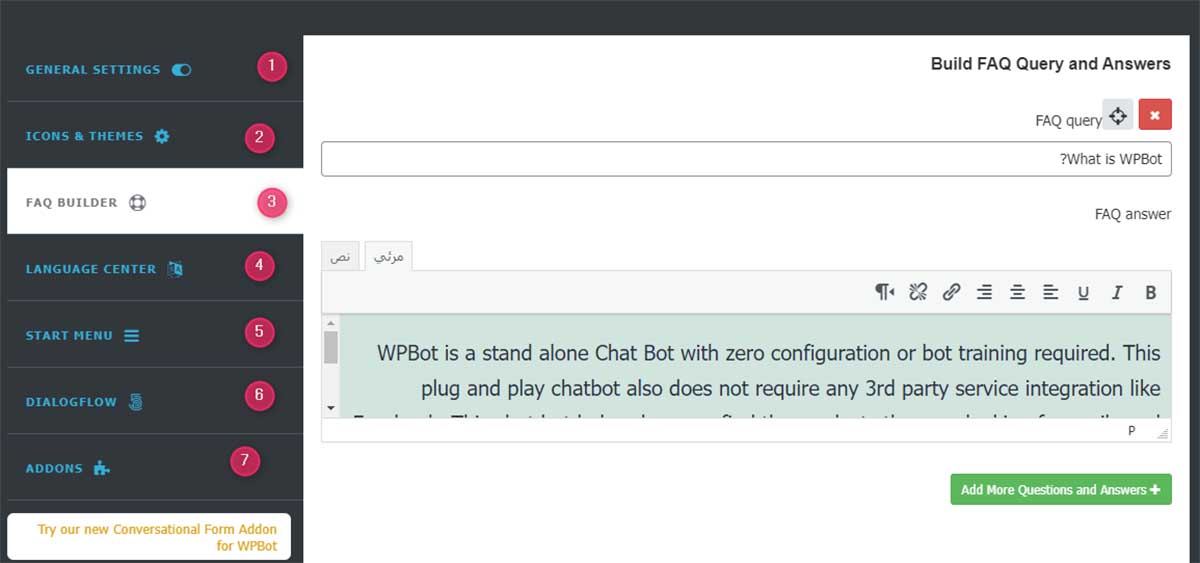 تمكنك ChatBot من إنشاء شات بوت بمجرد تركيب الإضافة وتلقين الروبوت الأسئلة المتوقعة من لوحة التحكم في الووردبريس دون أي خبرات برمجية.