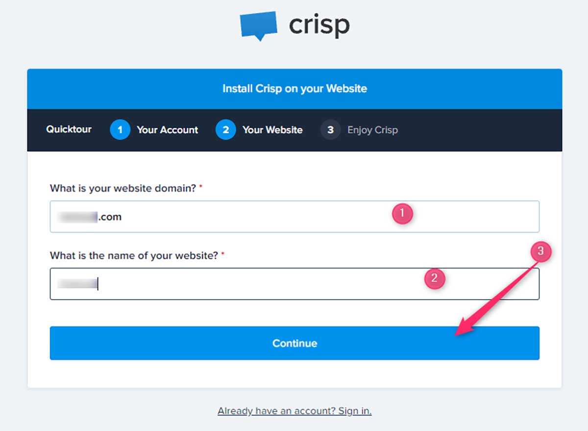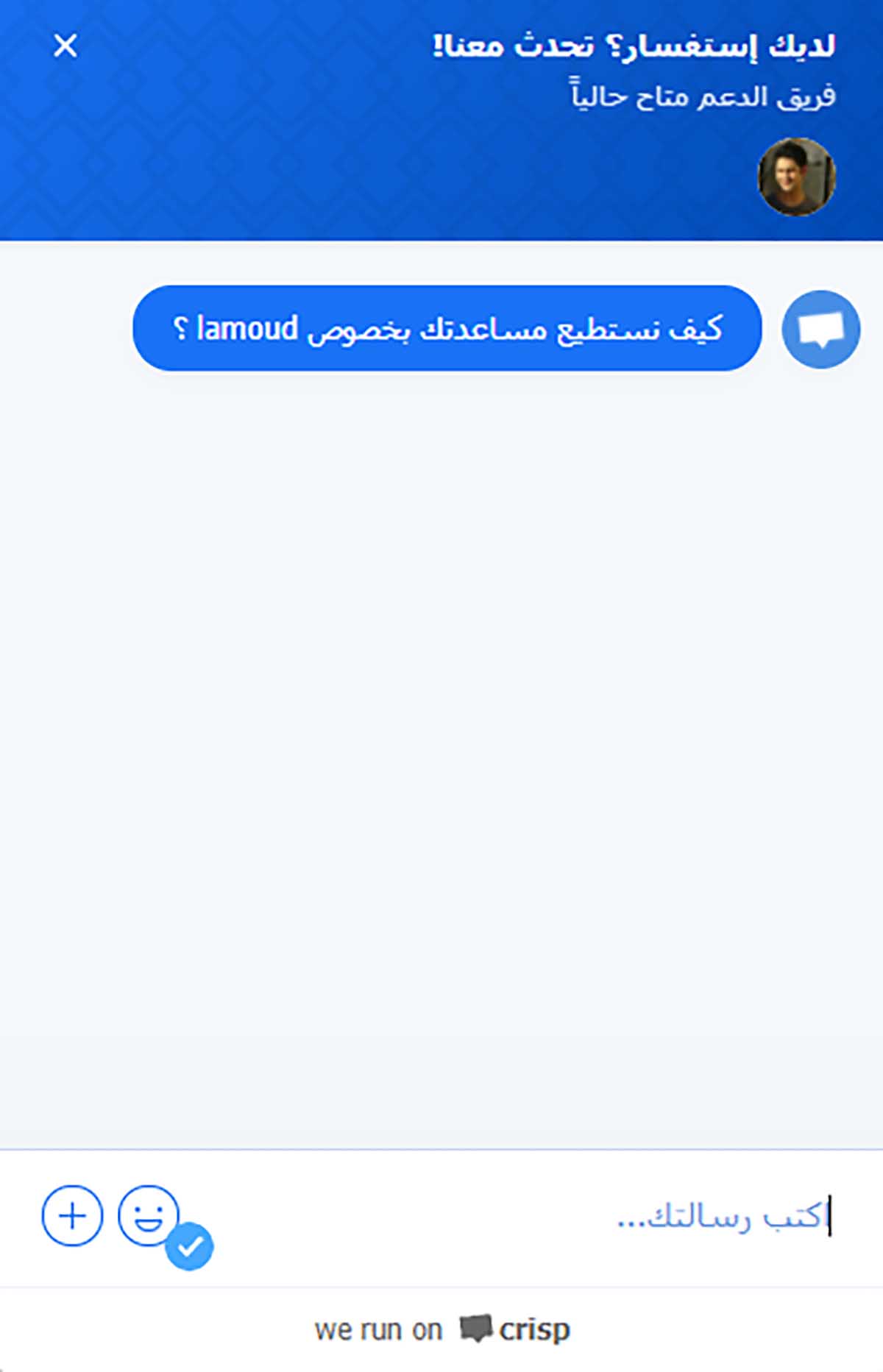 بعد الانتهاء من كافة الإعدادات بالأعلى ولصق API روبوت الدردشة التفاعلية من Crisp قم بزيارة موقعك وستلاحظ ظهور أيقونة الدردشة قم بالنقر عليها لتظهر نافذة مماثلة كما في الصورة أدناه.
