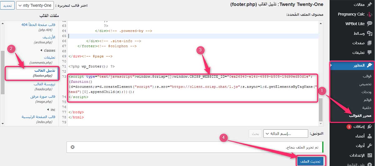 - انقر على ملف الفووتر (تذييل القالب) ثم أضف الكود الذي نسخناه من قبل في نهاية الملف، ثم انقر على حفظ التغييرات كما في الصورة أدناه.