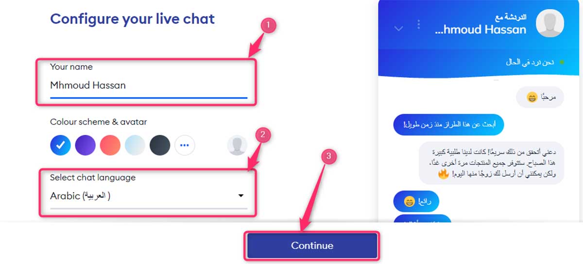- سيتم توجيهك مباشرة إلى موقع Tidio لبدء برمجة الشات بوت وتلقينه قوائم الأسئلة وإجاباتها. سيطلب منك الاسم واللغة كما هو موضح في الصورة بالأسفل.