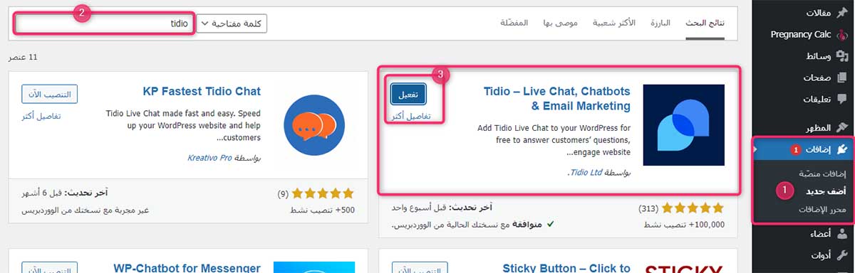 - في مربع البحث أكتب Tidio ثم قم بتحميل الإضافة وتفعيلها كما هو موضح في الصورة بالأسفل.