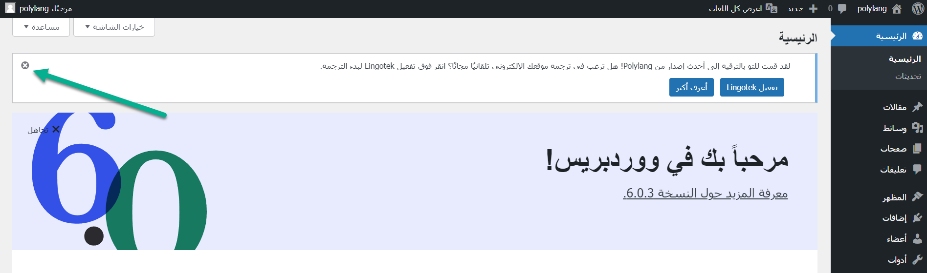 بمجرد العودة للصفحة الرئيسية، في الغالب سترى إشعارًا من إضافة Polylang تُخبرك عن إمكانية ترجمة محتوى الموقع تلقائيًا باستخدام إضافة أخرى اسمها Lingotek. يمكنك تخطي هذا الإشعار الآن.