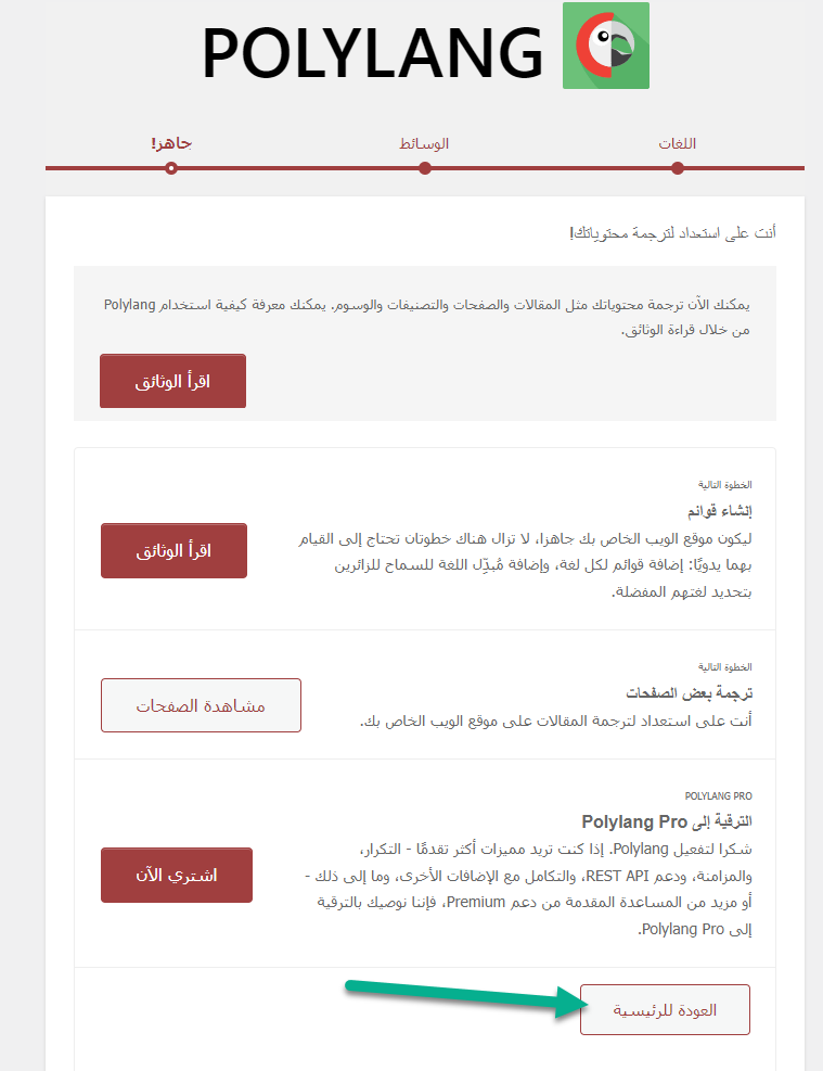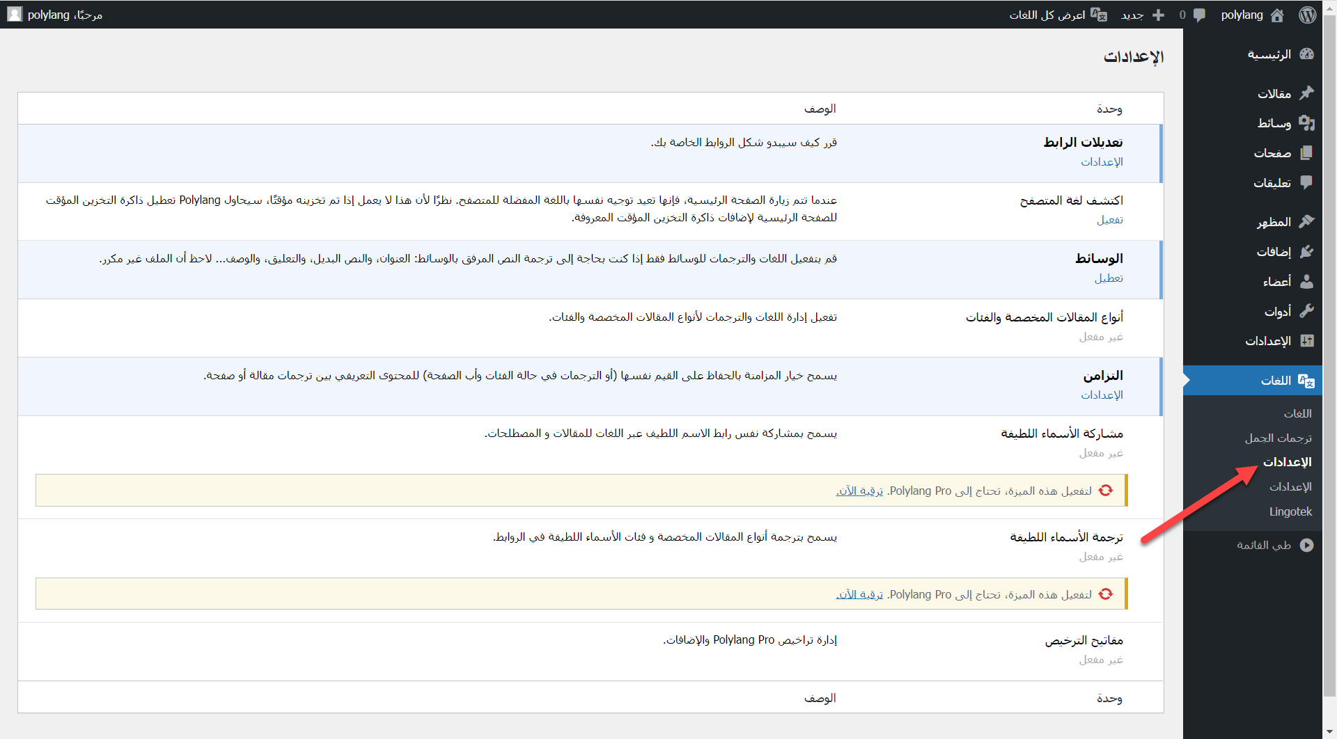 بقية الإعدادات منها يمكنها فتح المعالج الافتراضي مرة أخرى. كما يمكنك الربط مع إضافة Lingotek وهي بمثابة نظام إدارة ترجمة محترف، منه يمكنك ترجمة موقعك تلقائيًا، أو يمكنك إتاحة الفرصة للمترجمين العاملين معك على ضبط الترجمات، كما يمكنك طلب خدمات احترافية عبر الإضافة مباشرة.