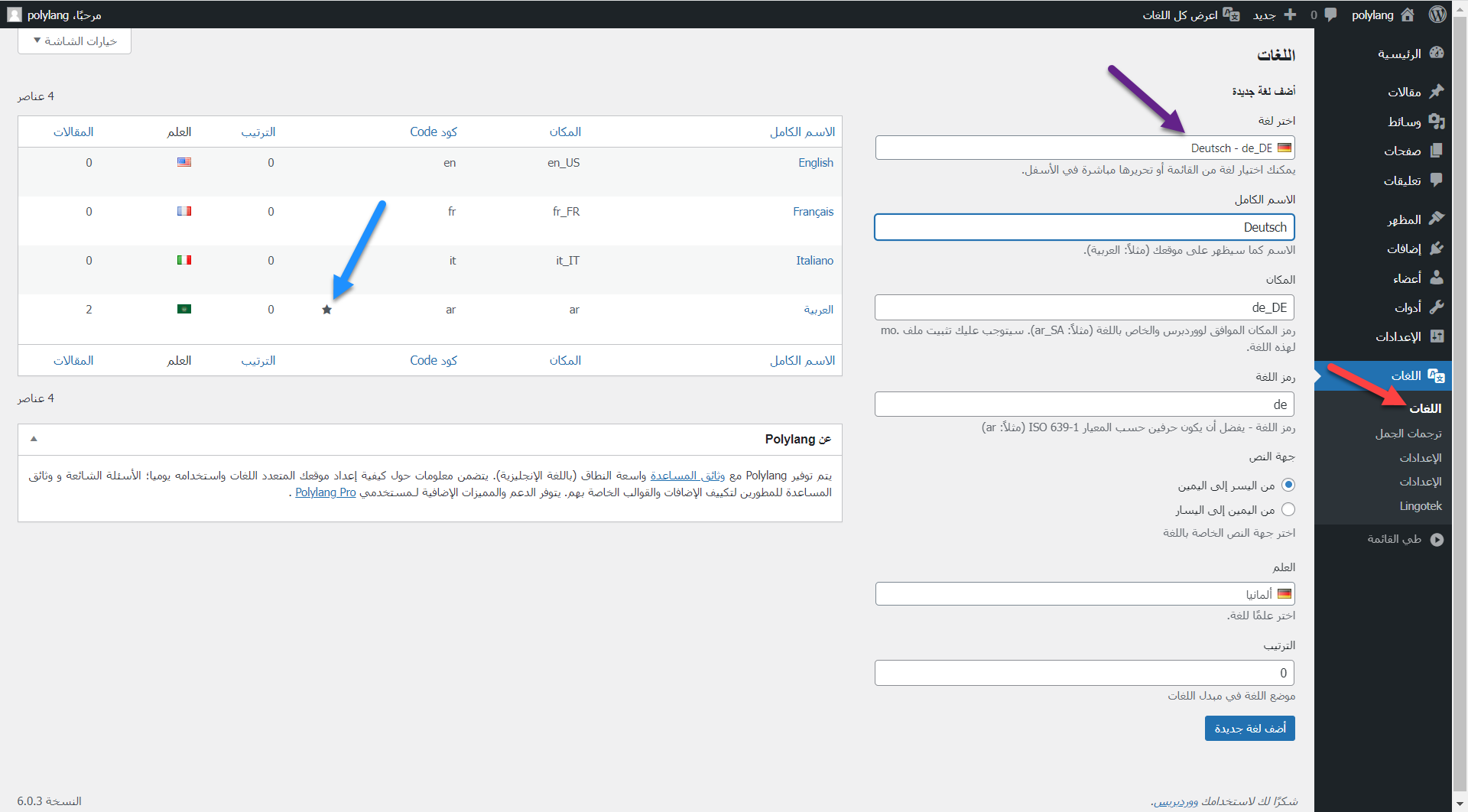كما يمكنك إضافة لغة جديدة بسهولة تامة. صحيح أن النظرة الأولى للخانات المطلوب منك تعبئتها قد تشعرك أن الأمر صعب، ولكنه في منتهى السهولة، حيث مطلوب منك فقط اختيار اللغة من الخانة المشار لها بالسهم البنفسجي، وستعمل الإضافة على تعبئة كافة الخانات المطلوبة بشكل تلقائي.