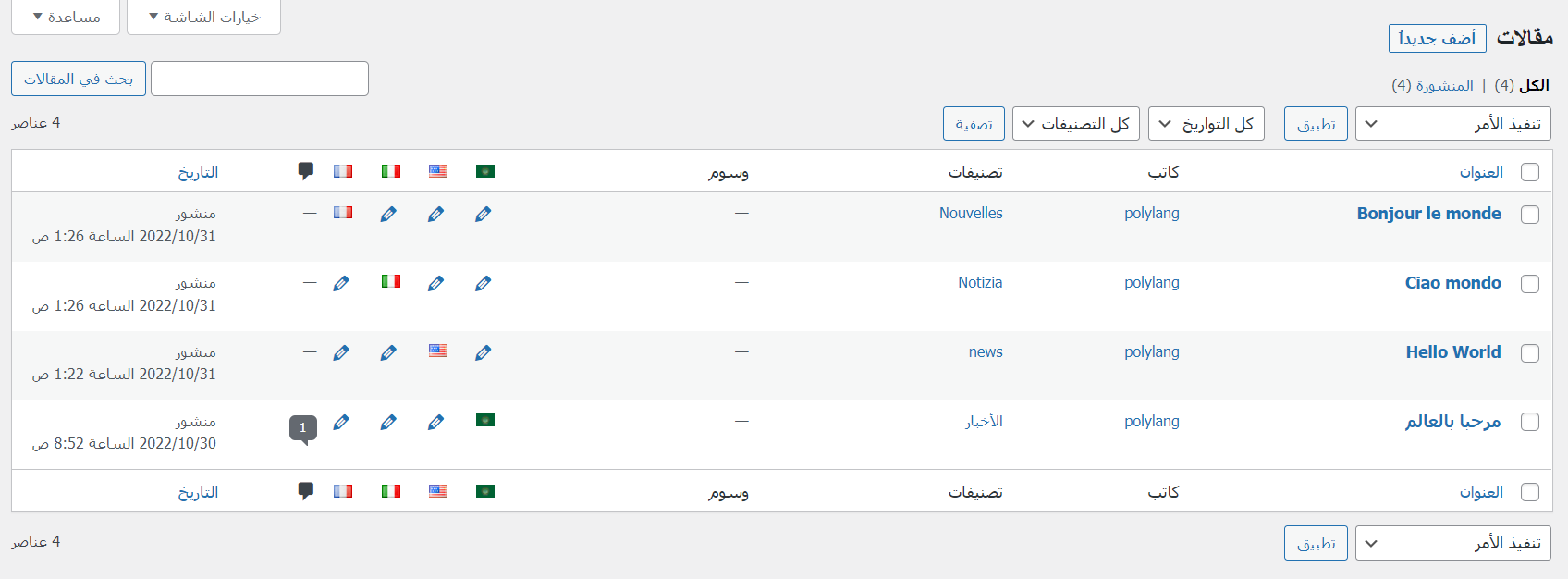 لاحظ بعد أن أضفت كل الترجمات المطلوبة لنفس المقال، أصبح لدي 4 مقالات منشورة علمًا أن التصنيفات الصحيحة لكل ترجمة يتم اختيارها تلقائيًا بشكل صحيح وبدون تدخل منك؛ وذلك لأنه معروف لدى الإضافة أن الترجمة الفلانية للمقال الأصل لابد أن توضع ضمن التصنيف الفلاني المخصص لهذه الترجمة.