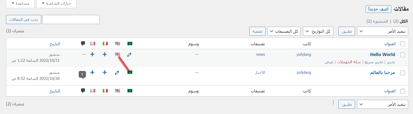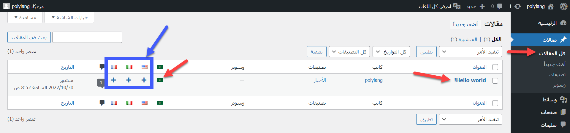 لدي مقال واحد بعنوان Hello World. ولأنني أثناء ضبط إعدادات المعالج الافتراضي اخترت اللغة العربية كلغة أساسية للموقع، فقد تم تعيين هذا المقال على أنه المقال المعروض لنسخة اللغة العربية، وستلاحظ وجود رمز + أمام الترجمات المتاحة، وهذا يعني أنه لا يوجد حتى الآن ترجمات من المقال الأصل.