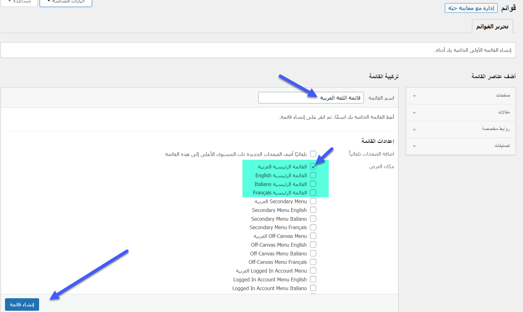 ستلاحظ في الصورة السابقة أن إضافة Polylang أضافت الترجمات المطلوبة للقوائم. هذا يعني أن عليك إنشاء قائمة رئيسية للموقع باللغة العربية، وكذلك إنشاء قائمة منفصلة لكل لغة متاحة.