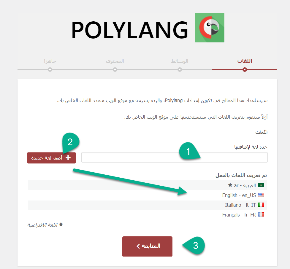 ستلاحظ أنني أضفت 4 لغات للموقع: اللغة العربية واللغة الإنجليزية واللغة الإيطالية واللغة الفرنسية. وبعد أن تنتهي من تحديد اللغات التي تريد إضافتها لموقعك الووردبريس متعدد اللغات أضغط على زر المتابعة.