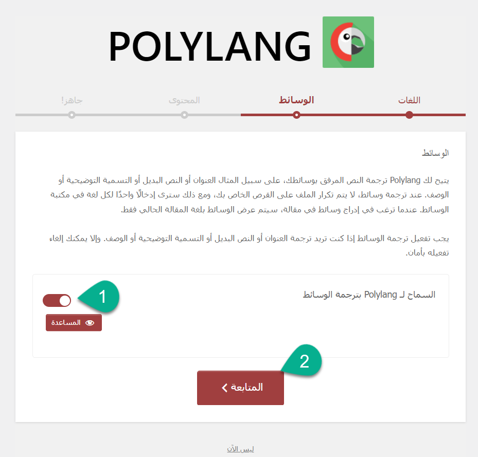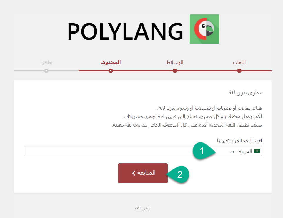 بمجرد تفعيل إضافة Polylang سيفتح معك معالج التثبيت الافتراضي المكوّن من 4 خطوات فقط وهدفه مساعدتك على ترجمة موقعك الووردبريس وجعله متعدد اللغات في ثواني معدودة.