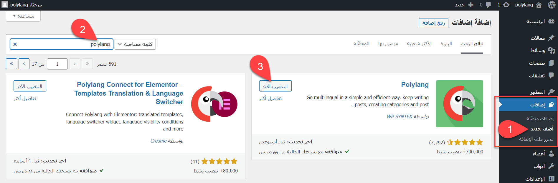 لتثبيت polylang، نفّذ نفس الخطوات المعتادة لتثبيت إضافات الووردبريس، وهي: