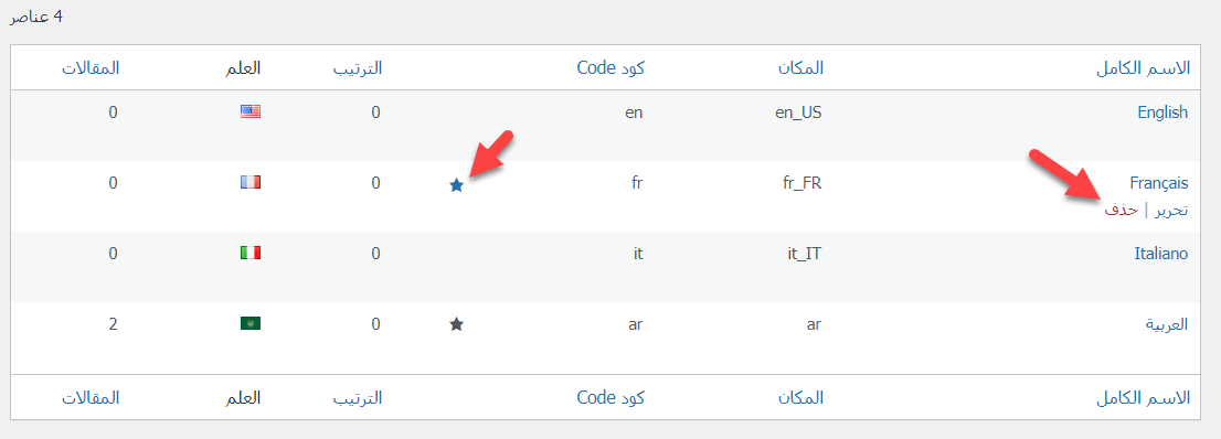 بمجرد الوقوف بمؤشر الماوس على أي لغة ستظهر 3 إمكانيات: حيث ستتمكن إما من تحرير اللغة أو حذفها، أو جعلها اللغة الافتراضية بالضغط على علامة النجمة.