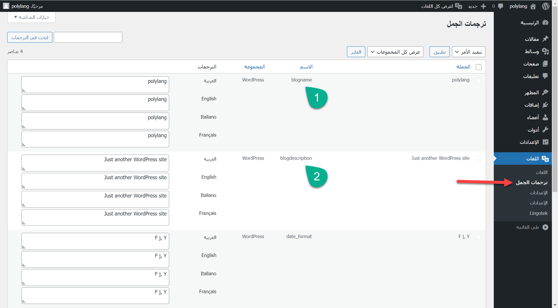 التاب الثاني من إضافة polylang هو تاب ترجمات الجمل، والذي من خلاله يمكنك ترجمة عنوان الموقع والوصف؛ بحيث إذا استعرض الزائر الموقع بلغة ما، يُعرض له الترجمة المناسبة.