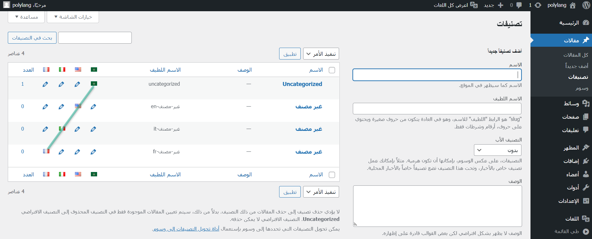 الآن وبعد أن فعلت إضافة Polylang، عملت الإضافة على إضافة تصنيفات أخرى مرتبطة بالتصنيف الافتراضي uncategorized فأصبح عندي كما ترى في الصورة السابقة 4 تصنيفات بواقع تصنيف واحد لكل لغة.