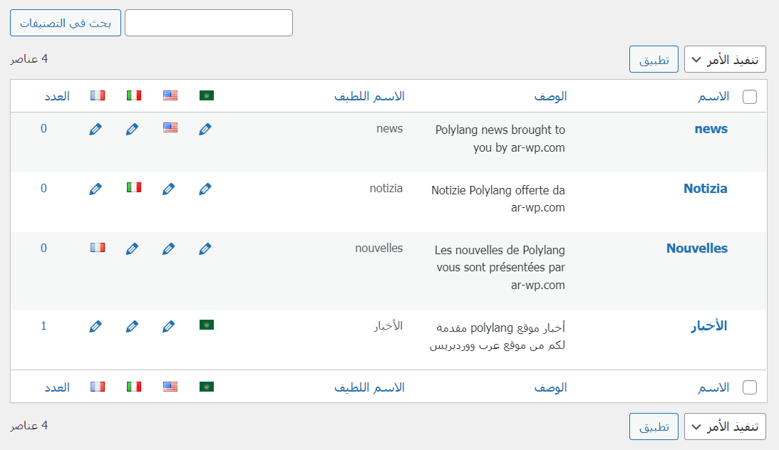 في موقعي لا أريد أن يكون اسم التصنيف (غير مصنف)، ولذلك عدلت اسم التصنيف الافتراضي إلى كلمة (الأخبار) ووضعت له وصف مخصص باللغة العربية، وعدلت بنفس الاسم والوصف على بقية الترجمات؛ فأصبح لديّ كما ترى في الصورة السابقة 4 تصنيفات عن الأخبار، بواقع تصنيف واحد لكل لغة.