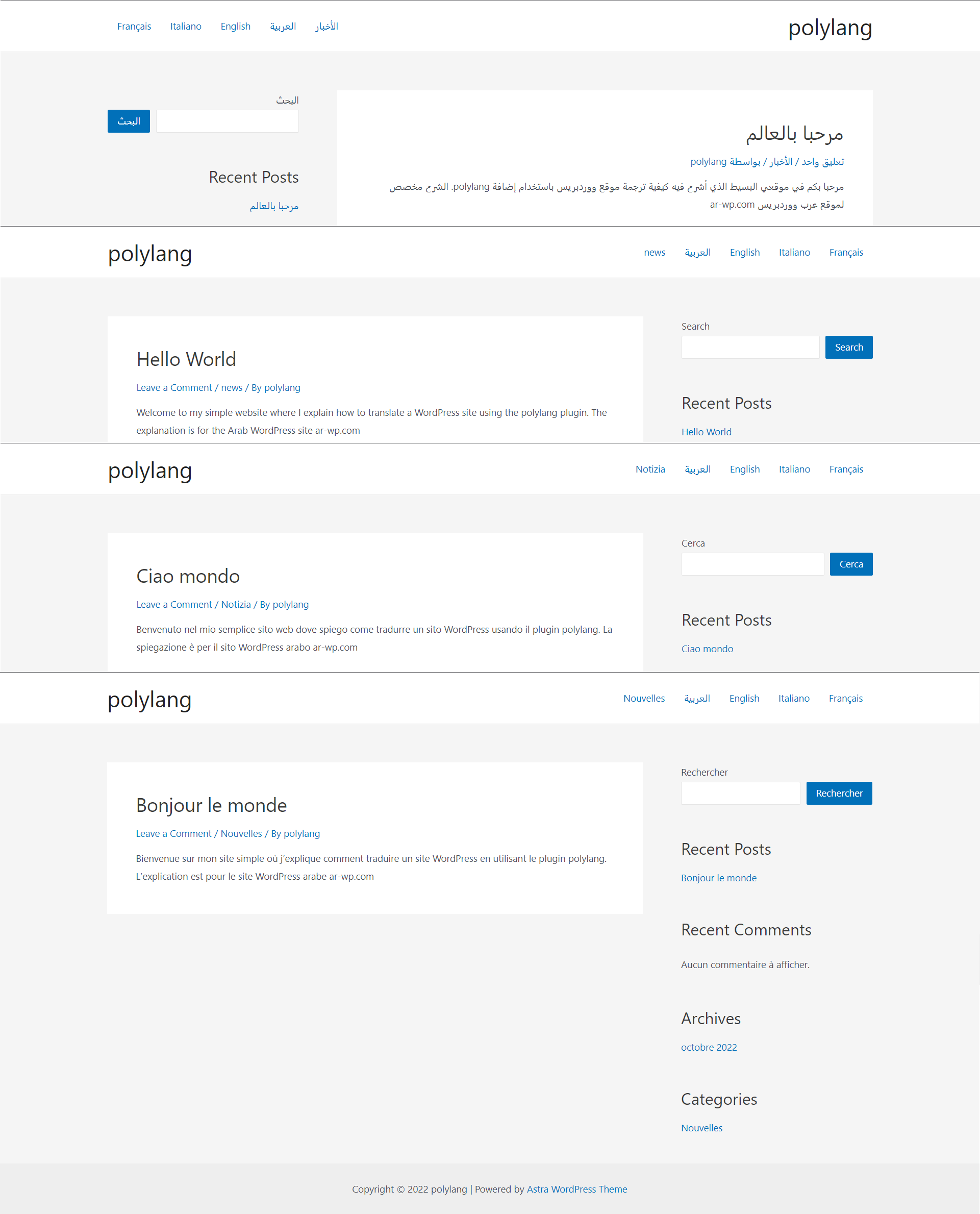 كما تلاحظ، في دقائق معدودات أصبح لدينا موقع ووردبريس متعدد اللغات باستخدام إضافة Polylang المجانية، التي مكنتني من اختيار اللغات المطلوبة للموقع وكذلك اللغة الافتراضية.