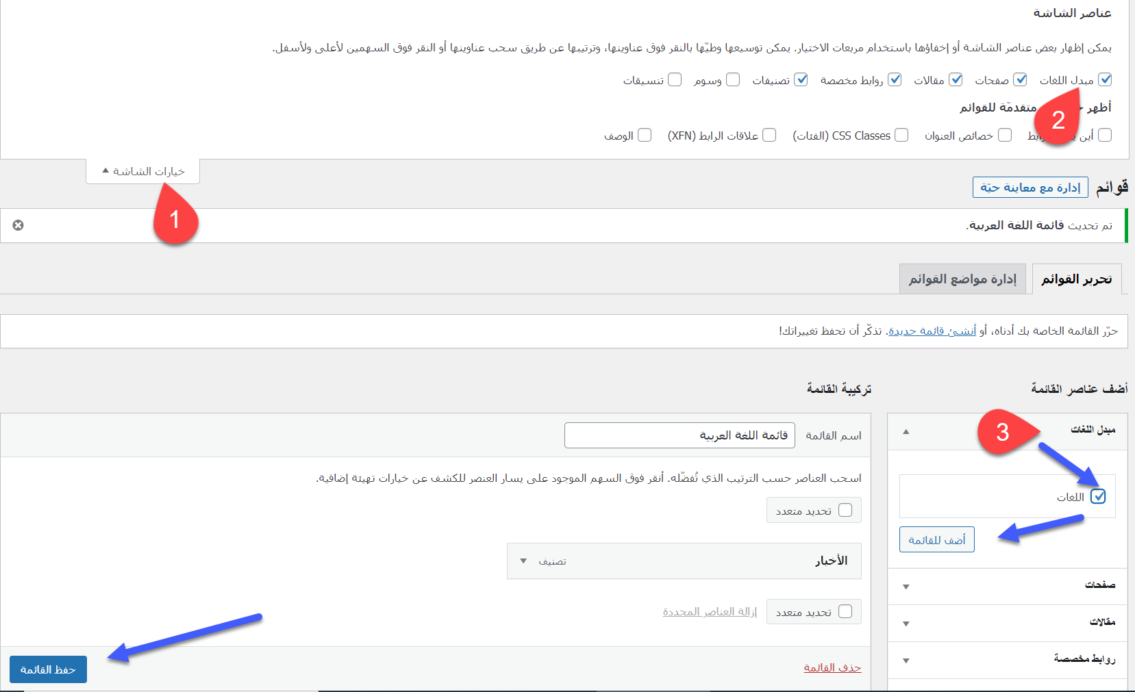 إضافة عناصر للقائمة أمر بسيط جدًا، فقط تحدد التصنيف المطلوب وتضيفه للقائمة. مبدل اللغات هو عنصر مخصص للقوائم يأتي افتراضيًا مع إضافة polylang؛ فإذا لم تجده ضمن عناصر القائمة، فيمكنك تفعيله من خيارات الشاشة كما تلاحظ في الصورة التالية: